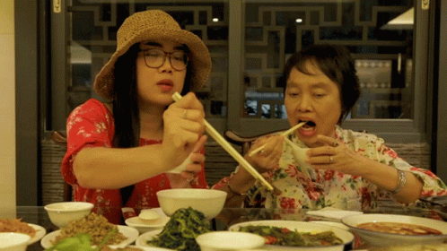 Godji and her mother, Tatchakorn Boonlapayanan, enjoy a delicious meal together, sharing food with chopsticks.