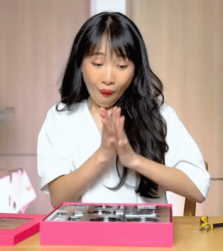 Softpomz reacts with excitement and claps her hands after opening a pink box.