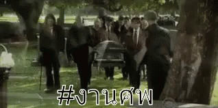 A group of people dressed in black suits carry a coffin through a cemetery during a funeral procession.