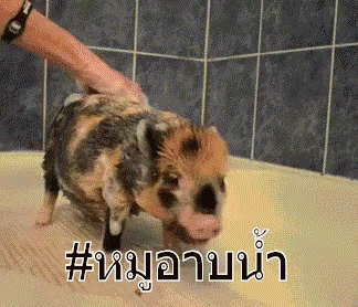A person gently bathes a small, multi-colored piglet in a bathtub, scrubbing it with soap.