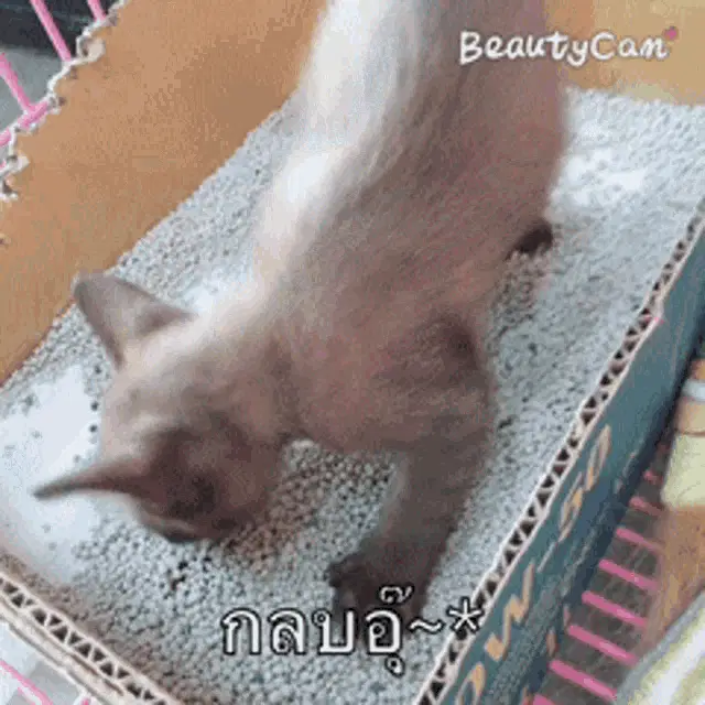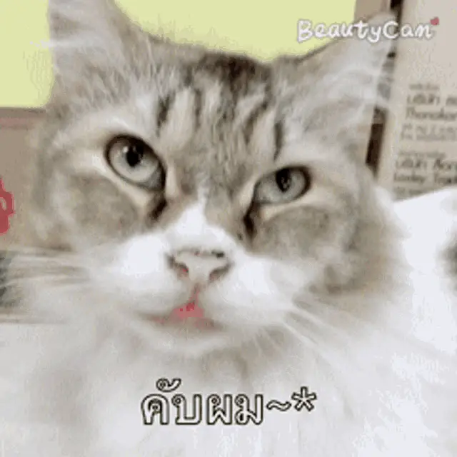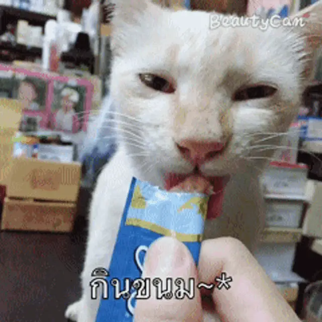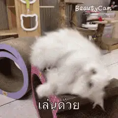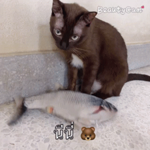 Nini the cat watches a wiggling fish on the floor, captured with BeautyCam.