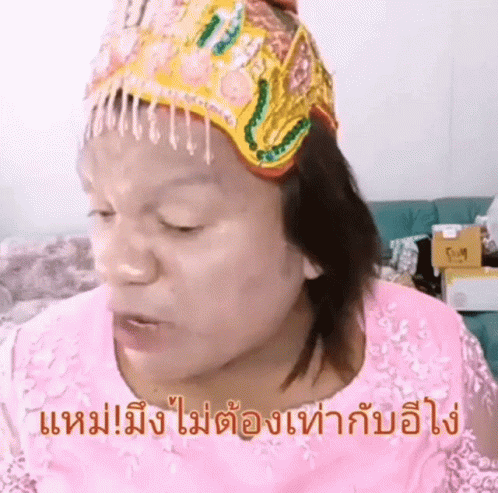 Bang Lee, also known as P' Ying Lee or Phra Maha Thewi Chao, speaks assertively while wearing a pink shirt and crown.