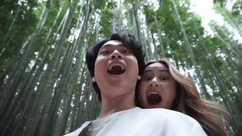 A couple, Yoonpic, in a bamboo forest, looking up with open mouths in surprise.