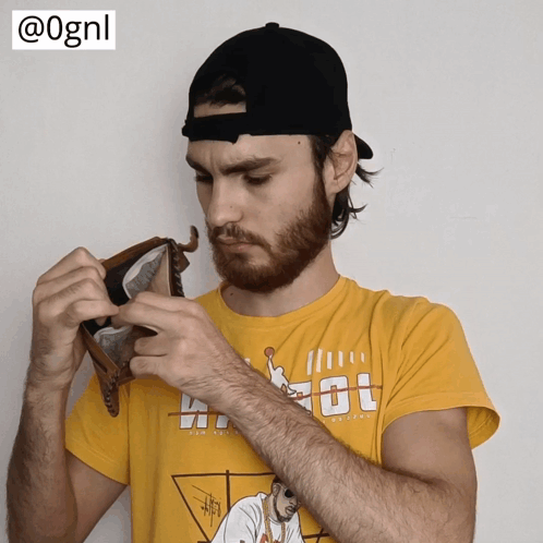 0gnl checks his wallet, finding no money, and looks disappointed.