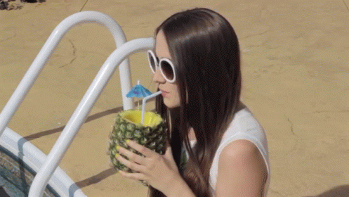 A woman with white sunglasses enjoys a refreshing drink from a pineapple cup by the pool, showcasing her yellow nail polish, leading to the 'Pineapple Nails' title card.