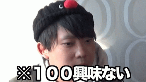 Edo in a unique knitted hat with a red nose, showing a surprised face with the caption '100% not interested'.