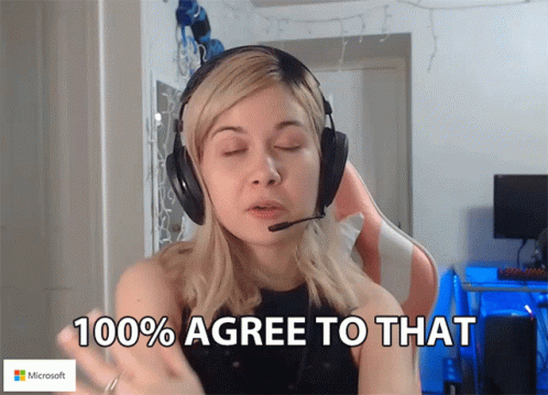 Madi Benge, wearing headphones, expresses strong agreement by saying '100% agree to that' in front of a Microsoft logo.
