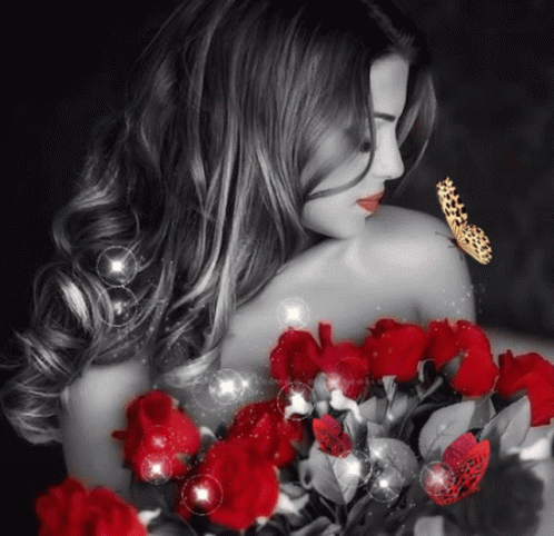 Elegant woman in black and white with vibrant red roses and a golden butterfly on her shoulder.