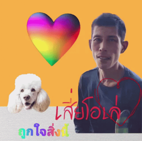 A man and a white poodle with a rainbow heart, featuring Thai text 'Like this thing' and 'Sia Ole'.
