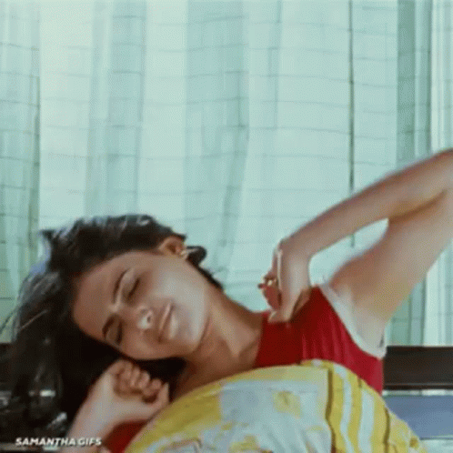Samantha wakes up in bed, stretching her arms and adjusting her hair while wearing a red top.