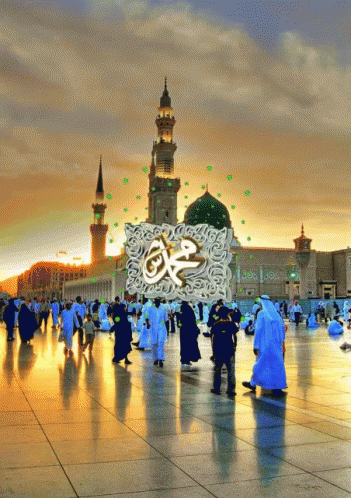 A group of people gathered in front of a mosque with Arabic writing.