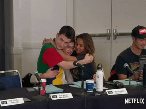 Dylan Minnette and Alisha Boe from 13 Reasons Why share a warm hug at a table with the Netflix logo.