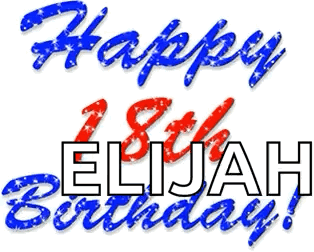 A vibrant graphic wishing Elijah a Happy 18th Birthday, featuring sparkling blue and red text.