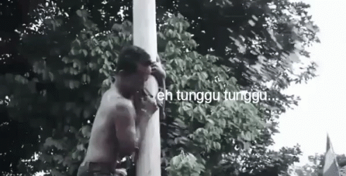 Men struggle to climb a greased pole in the traditional Indonesian game of Panjat Pinang, with captions saying "wait wait" and "you're slow."