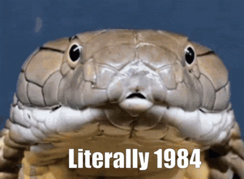 A close-up of a snake's face with a surprised expression, featuring the meme text 'Literally 1984'.