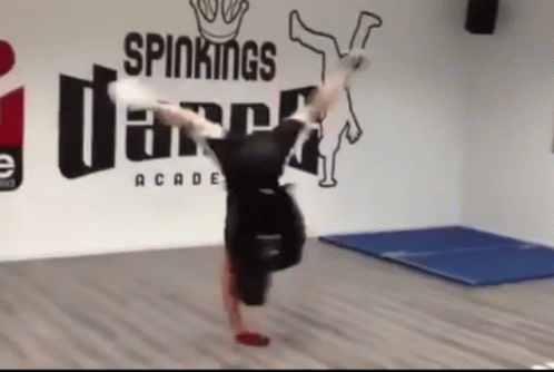 A bboy performs an impressive handstand spin, showcasing breakdancing skills at the Spinkings Dance Academy.