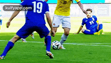 A soccer player wearing jersey number 19 skillfully kicks the ball into the net, scoring a goal during a match.