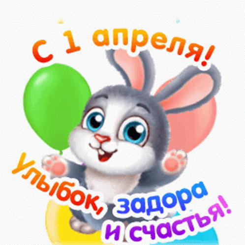A cute animated bunny with colorful balloons celebrates April 1st with wishes for smiles, enthusiasm, and happiness.