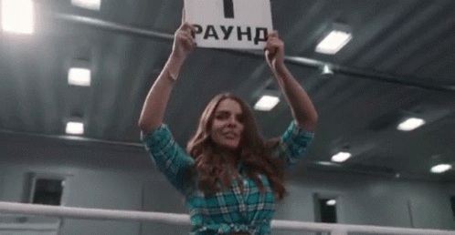 A smiling Round Girl holds up a sign for '1 РАУНД' (1st Round) in a brightly lit arena.