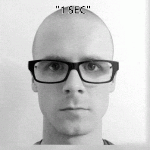 Black and white photo of a man wearing glasses with '1 SEC' text above his head.