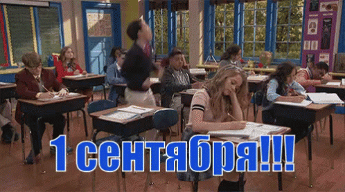 Excited students celebrate 1 September, Knowledge Day, in a classroom with a teacher jumping for joy.