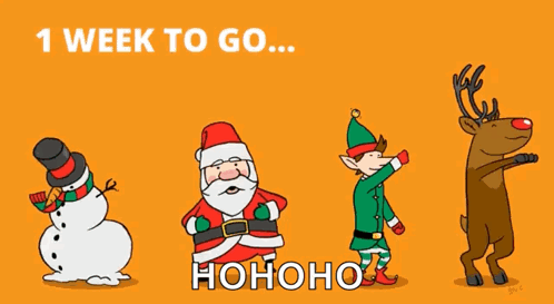 Santa Claus, an elf, and a reindeer dance excitedly as Christmas is just one week away, with 'HOHOHO' text.