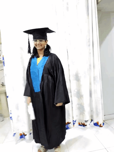 A happy graduate in a cap and gown celebrates with a joyful dance, marking her achievement.