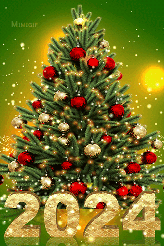A festive Christmas tree with red and gold ornaments, sparkling lights, and the golden year 2024, wishing a Happy New Year.