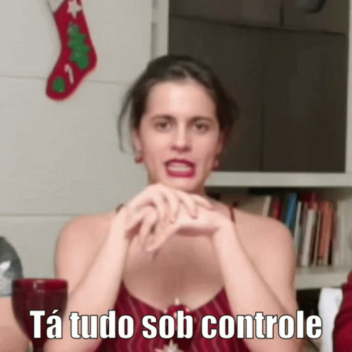 A woman in a red top confidently states 'Tá tudo sob controle' (Everything is under control) at a holiday gathering.