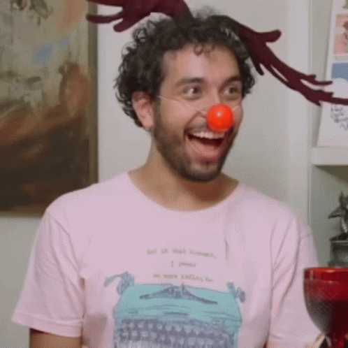 MaréGeek, wearing a pink shirt, reindeer antlers, and a red nose, looks excited and happy.
