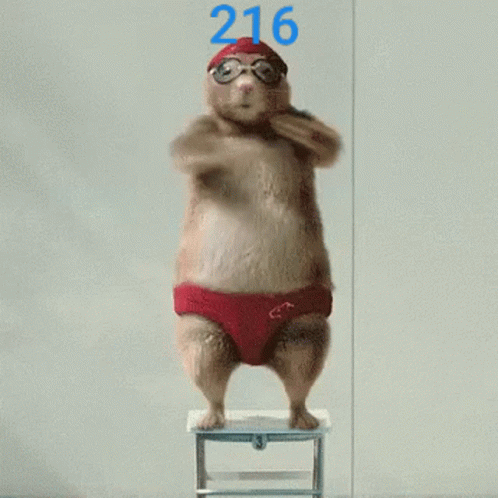 A hamster wearing a red swim cap and goggles stands on a stool, wiggling its paws, ready to swim.