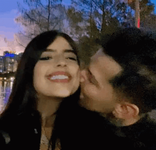 Jocelyn smiles broadly as a man kisses her cheek outdoors at night, with city lights in the background.