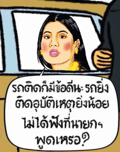 Sirivan, กบ, กล้า, ฟูฟู, เสี่ยโอ related cartoon woman in car discusses traffic jam advantages, referencing Prime Minister.