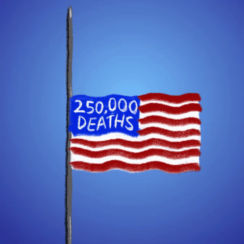 An American flag displayed with '250,000 DEATHS' written on its blue field, symbolizing a somber milestone.