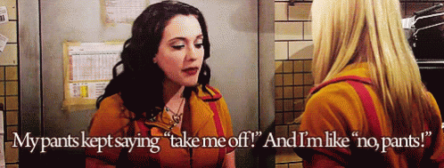 Kat Dennings in 2 Broke Girls humorously recounts her pants 'kept saying take me off' to another woman.