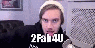 PewDiePie, wearing a beanie and hoodie, makes hand gestures with the caption '2Fab4U' displayed.