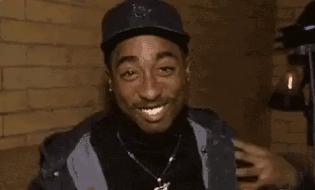 Tupac Shakur smiles and laughs, covering his face in a candid moment.