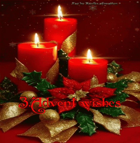 Three red Advent candles surrounded by festive holly, poinsettia, and golden ribbons, with the text '3 Advent wishes'.