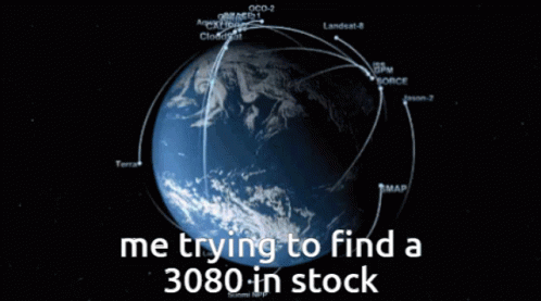 Animated Earth with text 'me trying to find a 3080 in stock', humorously depicting the search for the elusive graphics card.