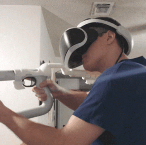 A man immersed in a virtual reality game, wearing a PS VR headset and holding a gun controller.