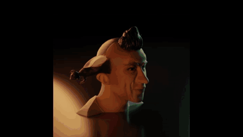 A 3D render of Shah Rukh Khan's head with a unique hairstyle, featuring dynamic color lighting.