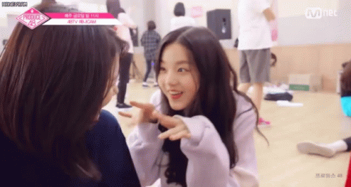 Two Produce 48 contestants share a cute moment, smiling and making playful gestures.