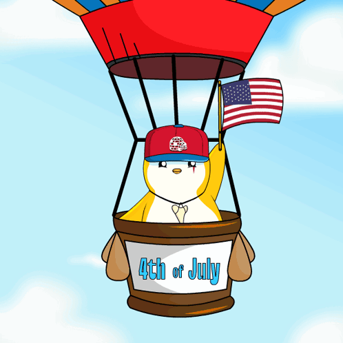 A cartoon penguin in a hot air balloon, holding an American flag and celebrating the 4th of July.