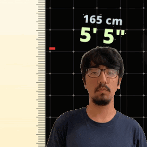 a man wearing glasses stands in front of a ruler that says 165 cm