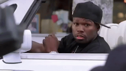 50 Cent in a car, giving a serious look before breaking into an iconic smile, often used as a goodbye meme.