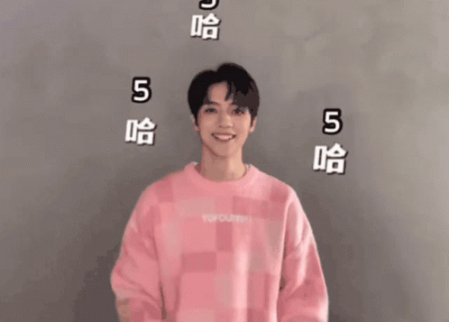 Luo Yizhou smiles wearing a pink sweater, surrounded by '5 Ha' text, indicating laughter.