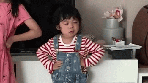 Rainy, a little girl in overalls, strikes a sassy pose with hands on hips, declaring she won't wait anymore.