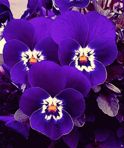 Close-up of beautiful pansy flowers, transitioning from vibrant purple to deep blue with white and yellow centers.