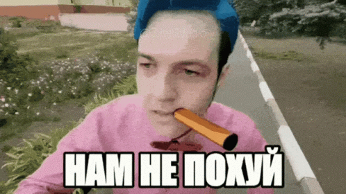 A man with blue hair and a pink shirt smokes a cigarette, with the Russian caption 'НАМ НЕ ПОХУЙ' (We don't care).