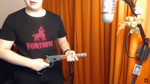 A man, 5opka from ФугаTV, wearing a Fortnite shirt, performs a gun stunt with a toy rifle.